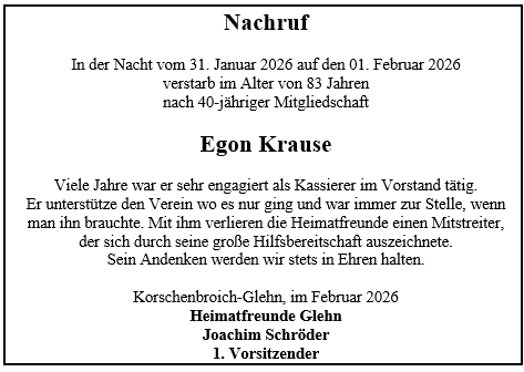 Die Heimatfreunde Glehn wünschen dem Königspaar, den Ministerpaaren sowie allen Schützen, Bürgerinnen und Bürgern ein frohes und sonniges Schützenfest.