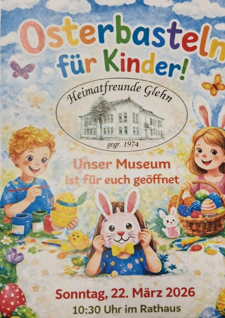 Los geht es am 22.03.26 mit unserem Osterbasteln. Während die Kids basteln können die Eltern bei einem Getränk in die Geschichte Glehns eintauchen und unser Museum erkunden.